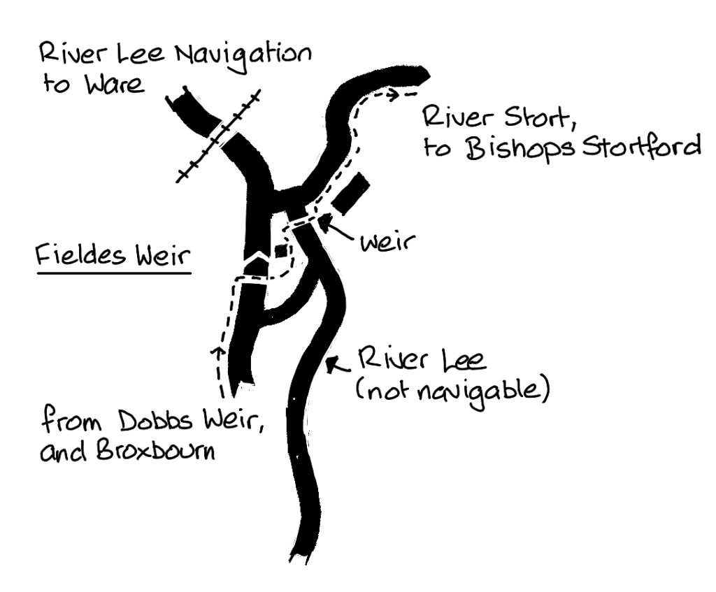 Just above Fieldes Weir the navigation splits: head right to Bishops Stortford (River Stort), left to Hertford (River Lea/Lee).