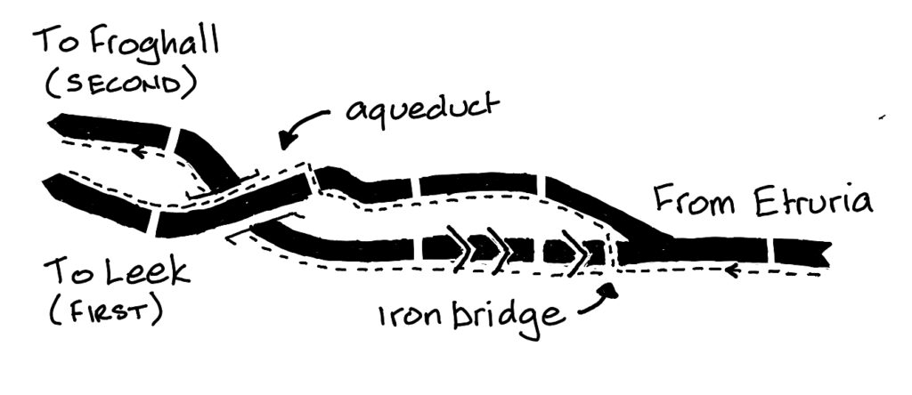 At Hazelhurst Junction ross the black and white iron bridge and continue along the right-hand canal towards Leek. Although this seems counter-intuitive, the canals cross at the aqueduct after half a mile.