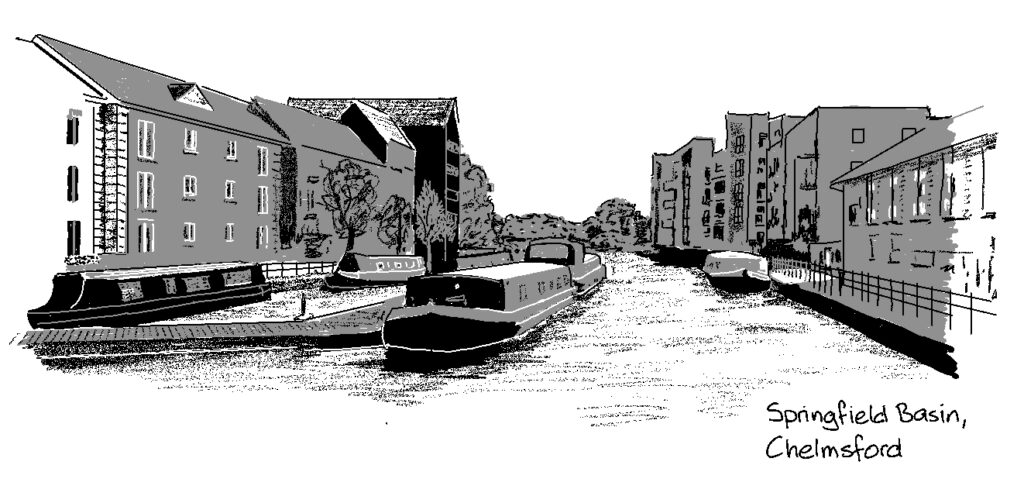 Next are some meadows with a poor path, including an awkward footbridge, then you suddenly find yourself in Chelmsford. Bear right, cross the steep bridge and ride to the end of Springfield Basin.