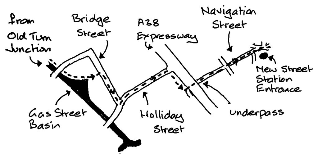 At Old Turn Junction cross the bridge over the Birmingham & Fazeley and continue 200m on the Worcester & Birmingham to Gas Street Basin, where the canal widens out to your left and there are moorings. From the corner of the basin cut through to Bridge Street. Turn right down to Holliday Street. Turn left on Holliday Street up towards the A38 Aston Expressway. Don’t attempt to cycle across this road as it is very busy, instead dismount on the left and cross to the right of Holliday Street at the junction with the A38, then cycle down the pedestrian slope to the underpass. Once under the underpass continue straight on Navigation Street to New Street Station with its shiny new facade. Take the train to Wilnecote (1-2 per hour, no reservation required).