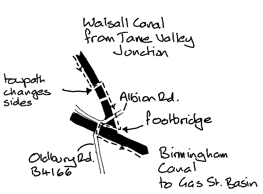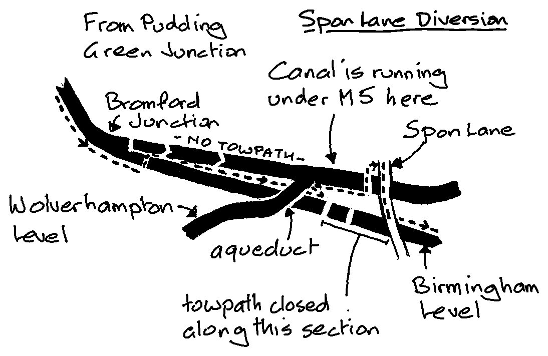 Note: Although the Nicholson Guide says there is a towpath on the other side of the Birmingham Level Mainline at this point, there isn’t, so you don’t have any easy alternative to this diversion.