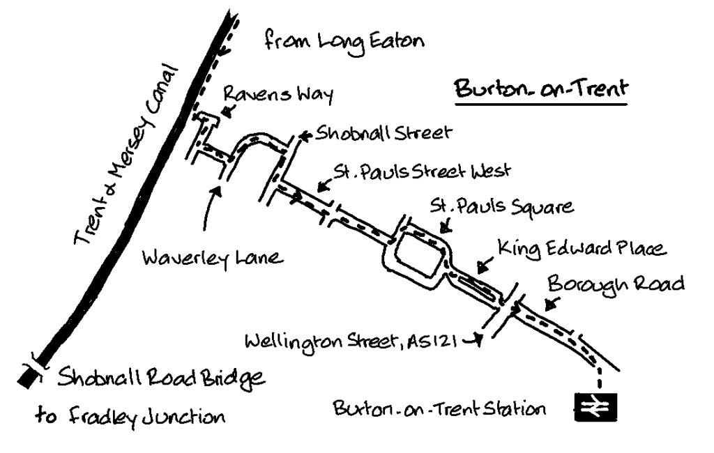 After Dallow Lock (7) but before the Shobnall Road bridge (33), take the alleyway to Ravens Way. Take Waverley Lane, Shobnall Street, St. Paul’s Street West, go round St. Paul’s Church, King Edward Place, straight on to Borough Road and the railway station is on your right. If you have time for a pint before you catch your train then visit the spectacularly unspoilt Coopers Tavern on Cross Street, DE14 1EG, just 5 minutes away, which unfortunately doesn’t open until 5pm.