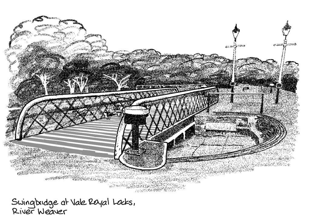 At the Red Lion cross the busy road and take the path to the right of the pub, bearing left to stay close to the river. Continue to the interesting Vale Royal Locks, where there are swing bridges as well.