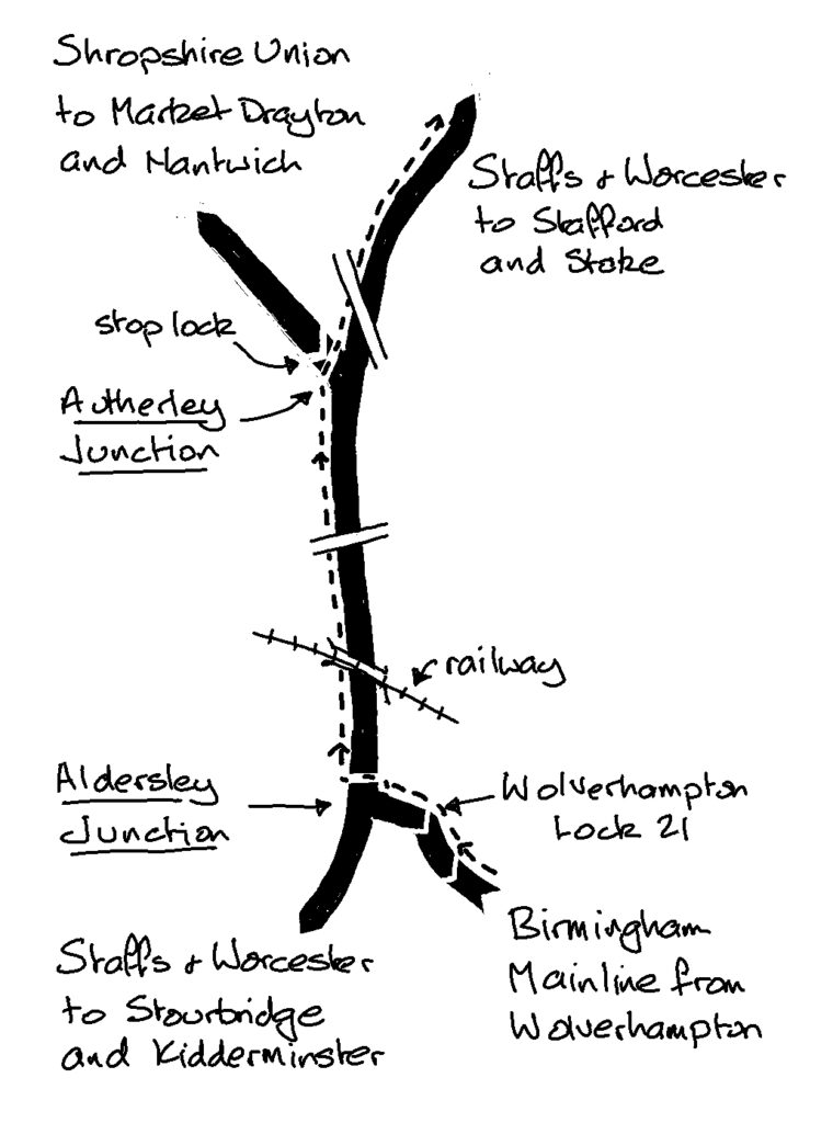 Turn right at the junction and cross the footbridge. Turn right onto the Staffs & Worcester Canal. Continue the short distance to Autherley Junction.