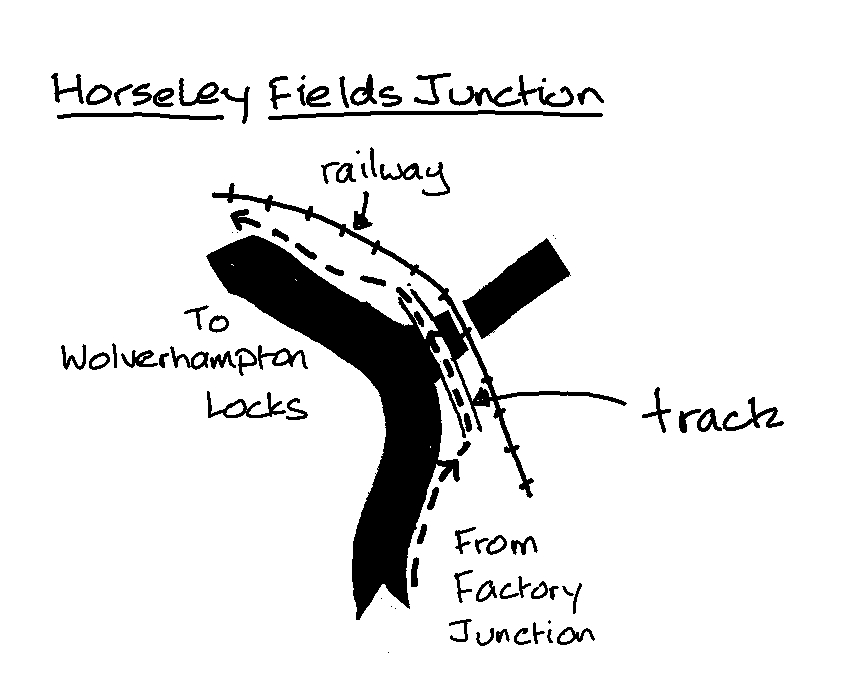 Continue along the Birmingham Mainline to Factory Junction, where the Birmingham and Wolverhampton Levels meet again. Go straight on at the junction.