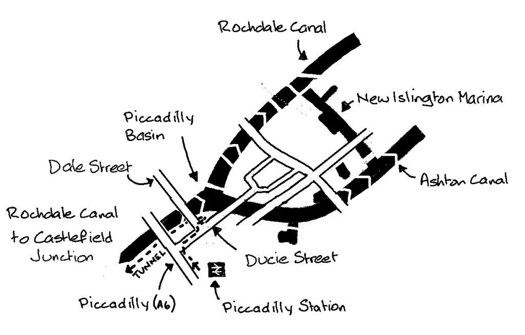 Emerging from Piccadilly Station main entrance head down the approach and turn right into Ducie Street. As you turn left into Dale Street there is a narrow entrance to your right, and a path leading down to the Rochdale Canal.