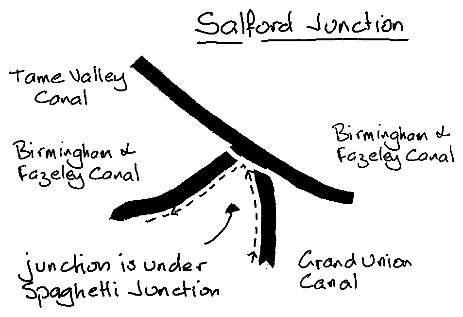 At the foot of the flight is Bordesley Junction: cross the bridge, and double back underneath it to continue on the Grand Union which heads off to the right. Again, not a very nice stretch of canal which continues 2.5 miles to Salford Junction, under the M6 at Spaghetti Junction. Admire the views of the flyovers and listen to the thundering traffic above you. Don’t stop too long or the particulates will get you.