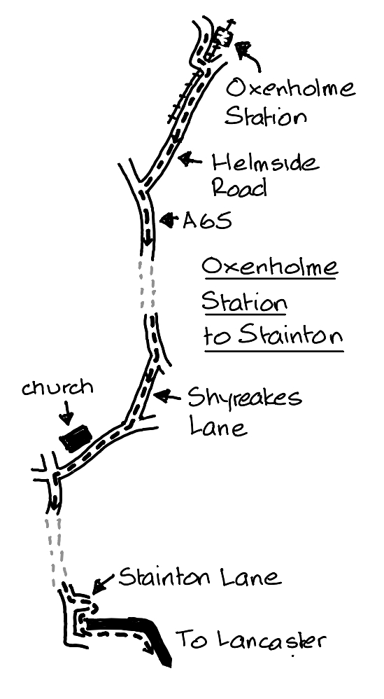 Leaving Oxenholme station turn left up the hill, and cross the railway. Turn right on Helmside Road to the A65, Burton Road. Turn left and continue for about a mile on the A65 then turn right on Shyreakes Lane. Turn right at the T junction and left at the crossroads just past the church towards Stainton.