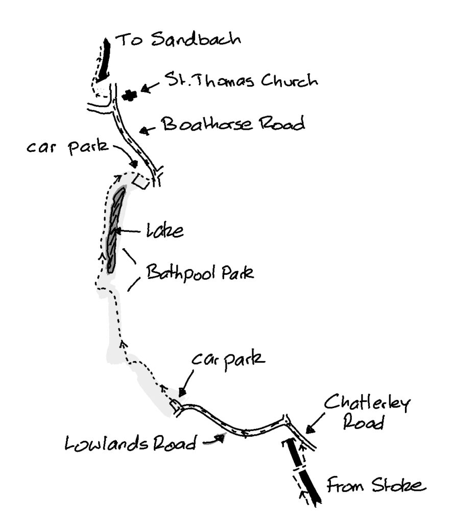Turn left on the road to the roundabout. Take the first exit, Lowlands Road. Follow this 500m to Bathpool Park car park on the right. Follow the tarmac trail through the park and around the left side of the lake. Exit the park via the northern car park and turn left on Boathorse Lane (the old horse track over the tunnel). At The Avenue T junction turn right, then take the signed path opposite St. Thomas Church, which leads you back to overlook the north tunnel entrance. You will notice the water is bright orange, due to iron oxide leaching from the tunnel.