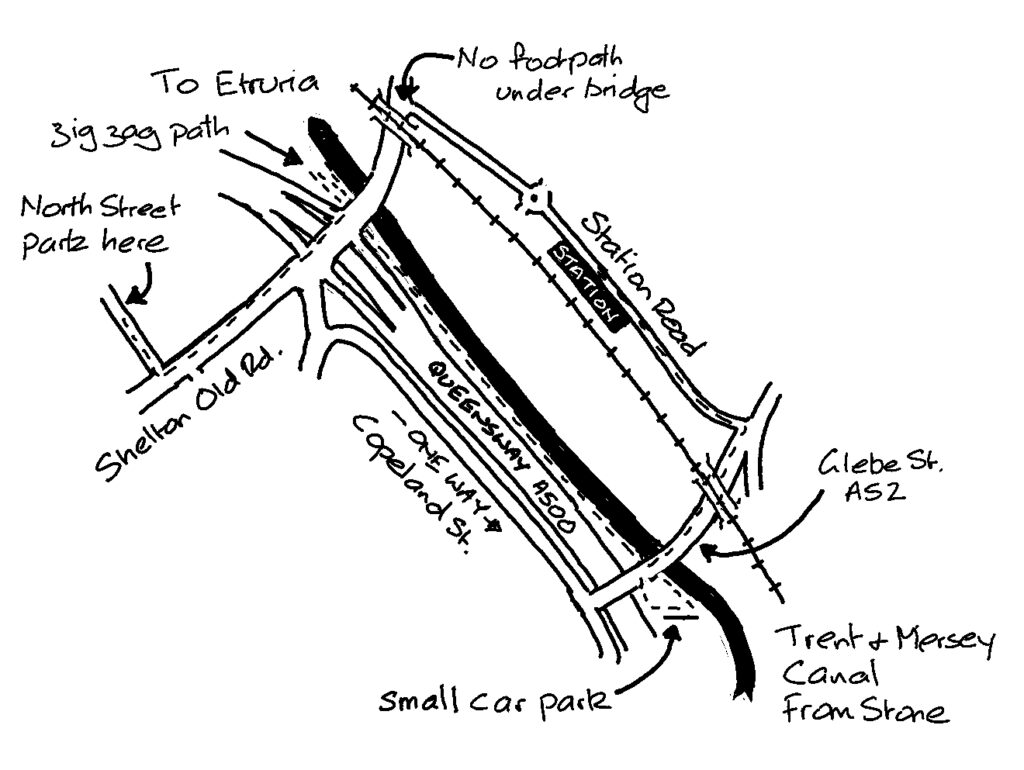 Trains are 1 per hour. Change at Crewe for Stoke (platform 3). No booking necessary on the trains. Turn right out of the Stoke Station to Glebe Street, A52. Turn right under the railway, and left into the small car park after crossing the canal. Cut through to the canal towpath and turn left back under the A52. After passing under the next bridge (Stoke Road, A5006) take the zigzag path up the slope. Cross Queensway on the pavement and continue on the pavement next to Shelton Old Road (i.e. against the one-way system flow) to North Street. Turn right back to your car.